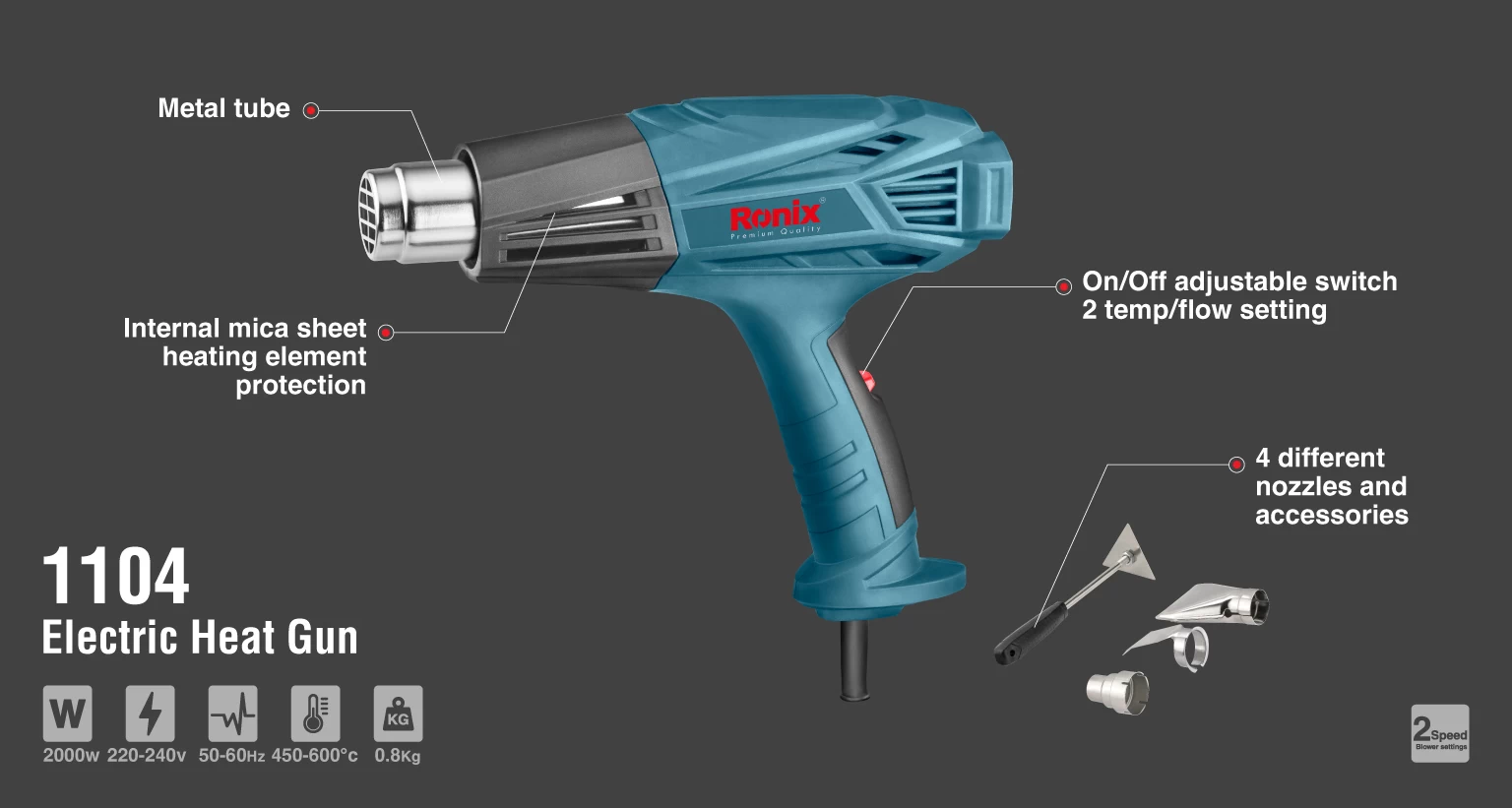 سشوار برقی صنعتی 1104 رونیکس، مجهز به موتور قدرتمند به توان 2000 وات است؛ در کاربردهایی نظیر رنگزدایی، خشککردن و یخزدایی، امور مربوط به نجاری، در محیطهای ثابت و کارگاهی از آن استفاده میشود. این ابزار برقی قدرتمند، تنوع کاربری گستردهای را به شما ارائه میدهد. این محصول، یک کلید دو وضعیتی دارد که در حالت اول، دمای 450 درجه سانتیگراد و حجم هوای خروجی 250 لیتر در دقیقه و در حالت دوم، دمای 600 درجه سانتیگراد با حجم هوای خروجی 500 لیتر در دقیقه را ایجاد میکند. همچنین، سیستم محافظت در برابر بار اضافی در آن تعبیه شده است.