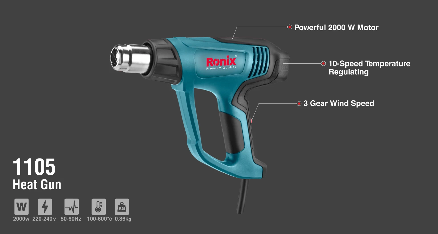 سشوار صنعتی 1105 رونیکس، مجهز به یک موتور قدرتمند 2000 واتی و براشلس است. از این محصول در کاربردهایی نظیر برداشتن رنگ از روی فلز، نصب یا قوسدادن به لولهها، برداشتن چسب لیبلها از روی شیشه، تعمیرات تجهیزات اسکی و تختههای موجسواری استفاده میشود. محدوده دمای کاری این سشوار، 100 تا 600 درجه سانتیگراد است.کلید قطع و وصل این دستگاه در سه حالت قابل تنظیم است. در حالت اول، میتوانید هوای خروجی حداقل را تنظیم کنید. در حالت دوم، هوای خروجی متوسط و در حالت سوم، هوا با دبی خروجی حداکثری قابل تنظیم است. با وجود دیمر پشت دستگاه نیز میتوانید میزان درجه حرارت را کنترل کنید. صدای تولیدی این دستگاه، 60-50 دسیبل است.