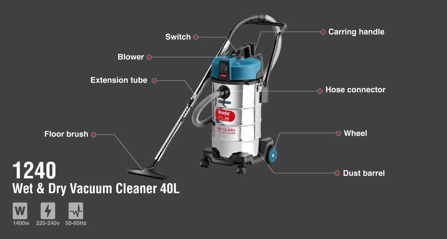 جارو برقی صنعتی 1240 دستگاهی با دو عملکرد مکندگی و دمندگی است. با اتصال شلنگ خرطومی به محل اتصال دمنده میتوان از قابلیت دمندگی این دستگاه استفاده کرد. این جارو برقی به یک موتور قدرتمند و کمصدا با توان 1400 وات مجهز شده که هوا را با فشار 17 کیلوپاسکال و دبی خروجی 1.8 متر مکعب در دقیقه مکش میکند. برخورداری از این ویژگی ها باعث شده تا محصول 1240 رونیکس انتخابی مناسب برای تمیزکردن گردوغبار از سطوح خشک و مرطوب در فضاهای داخلی و بیرونی باشد.این جارو برقی مجهز به یک مخزن 40 لیتری است که از ظرفیتی مناسب برای تمیزکاریهای در محیطهای بزرگ برخوردار است. همچنین درون این مخزن 40 لیتری، یک فیلتر HEPA با قابلیت شستشو قرار داده شده که در افزایش طول عمر موتور و بهبود عملکرد دستگاه بسیار موثر است. برای حمل و نقل راحت این جارو یک پایه چرخدار و یک دستگیره فلزی در نظر گرفته شده است.
