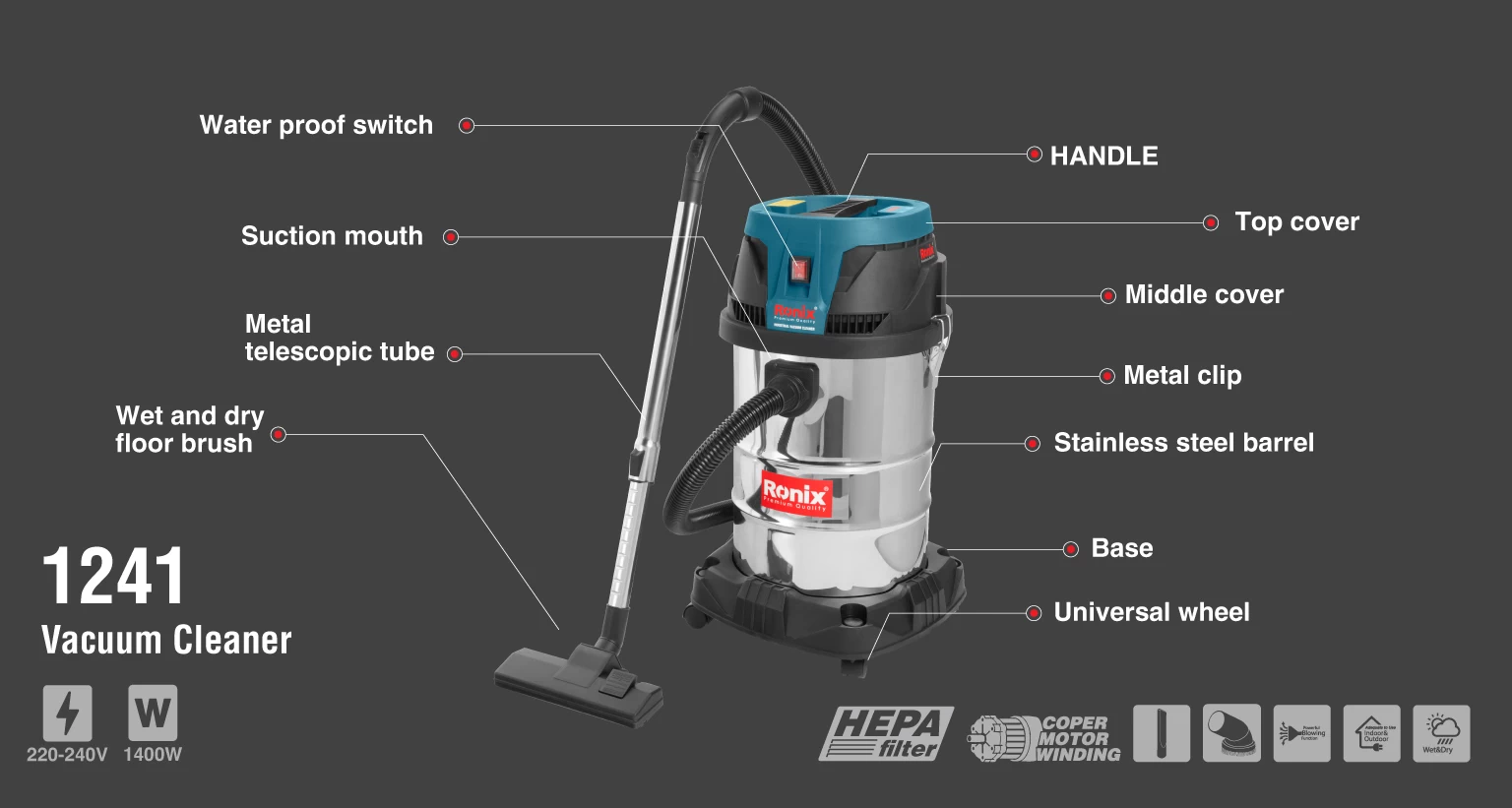 جارو برقی صنعتی 1241 رونیکس، دستگاهی کاربردی برای نظافت و تمیزکردن کارگاهها و کارخانهها است که از قدرت مکش فوقالعادهای برخوردار است. این دستگاه قدرتمند، مجهز به یک موتور 1400 وات کمصدا است که هوا را با فشار 20 کیلو پاسکال و دبی 1,9 متر مکعب بر دقیقه مکش میکند. این ابزار پرکاربرد، با قدرت و کارایی بالای خود، مناسب برای جمعآوری انواع زبالههای خشک و مرطوب و استفاده در فضاهای داخلی و بیرونی است.این جارو برقی به یک مخزن 40 لیتری استیل مجهز شده که ظرفیت مناسبی را برای انجام کارهای سبک و سنگین فراهم میکند. همچنین، از یک فیلتر HEPA برخوردار است که ذرات معلق بزرگتر از 0.3 میکرون را حذف میکند و در بهبود عملکرد دستگاه بسیار موثر است.