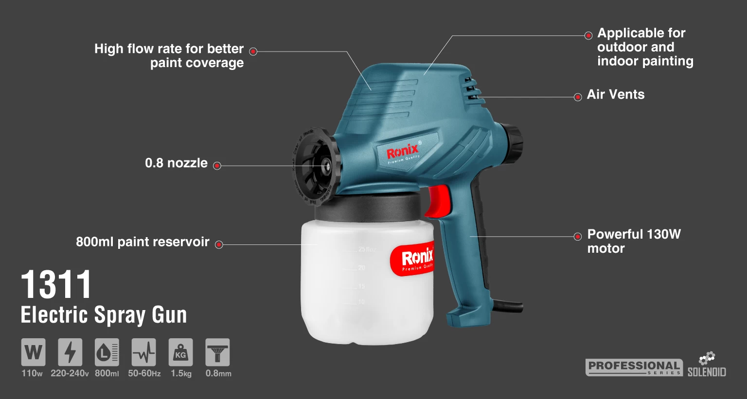 از پیستوله رنگپاش برقی سلنوئیدی 110 وات رونیکس مدل 1311 برای نقاشی سطوح مختلف در مصارف خانگی و صنعتی استفاده میشود. در این سیستم، رنگ بر روی سطوح به صورت یکنواخت و با کیفیت بالایی پخش میشود. این پیستوله برای پروژههای رنگکاری که جزئیات در آنها اهمیت دارد، مناسب است. مجموعه عملکرد نازل و موتور پرقدرت پیستوله برقی 1311 رونیکس، حداکثر جریان 300 میلیلیتر بر دقیقه را با ویسکوزیته 60 دین بر ثانیه ایجاد میکند. دکمه کنترل جریان در این پیستوله برقی، میزان خروجی مواد را با توجه به پروژه مورد نظر تنظیم میکند.