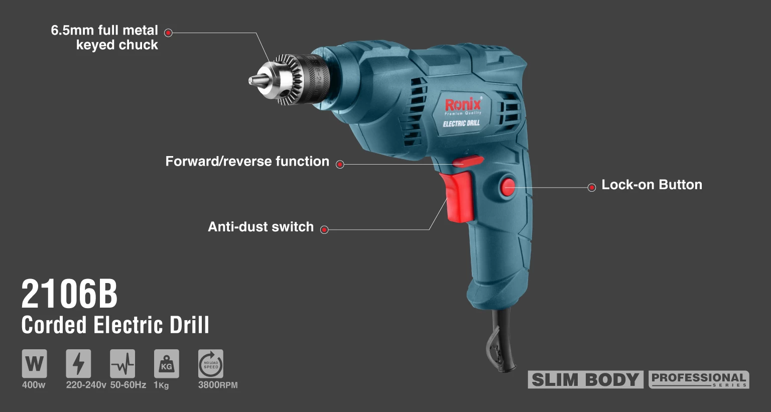 دریل برقی 6,5 میلیمتری 400 وات رونیکس مدل 2106B به راحتی کار سوراخکاری و دریلکاری در چوب و فلز را انجام میدهد. سرعت این دریل برقی در حالت آزاد بین صفر تا 3800 دور بر دقیقه قرار دارد و سهنظام آن مستحکم و آچاری 6,5 میلیمتری است.از این دریل برقی سوراخکاری سطوح چوبی یا فلزی و بستن پیچها استفاده میشود. استفاده از کلید ضد غبار دور متغیر با قابلیت راستگرد، چپگرد و مطابق با استاندارد TUV از دیگر ویژگیهای مهم این دریل قدرتمند است. در بخش توضیحات محصول، ویژگیهای دریل برقی رونیکس مدل 2106B بررسی شده است.