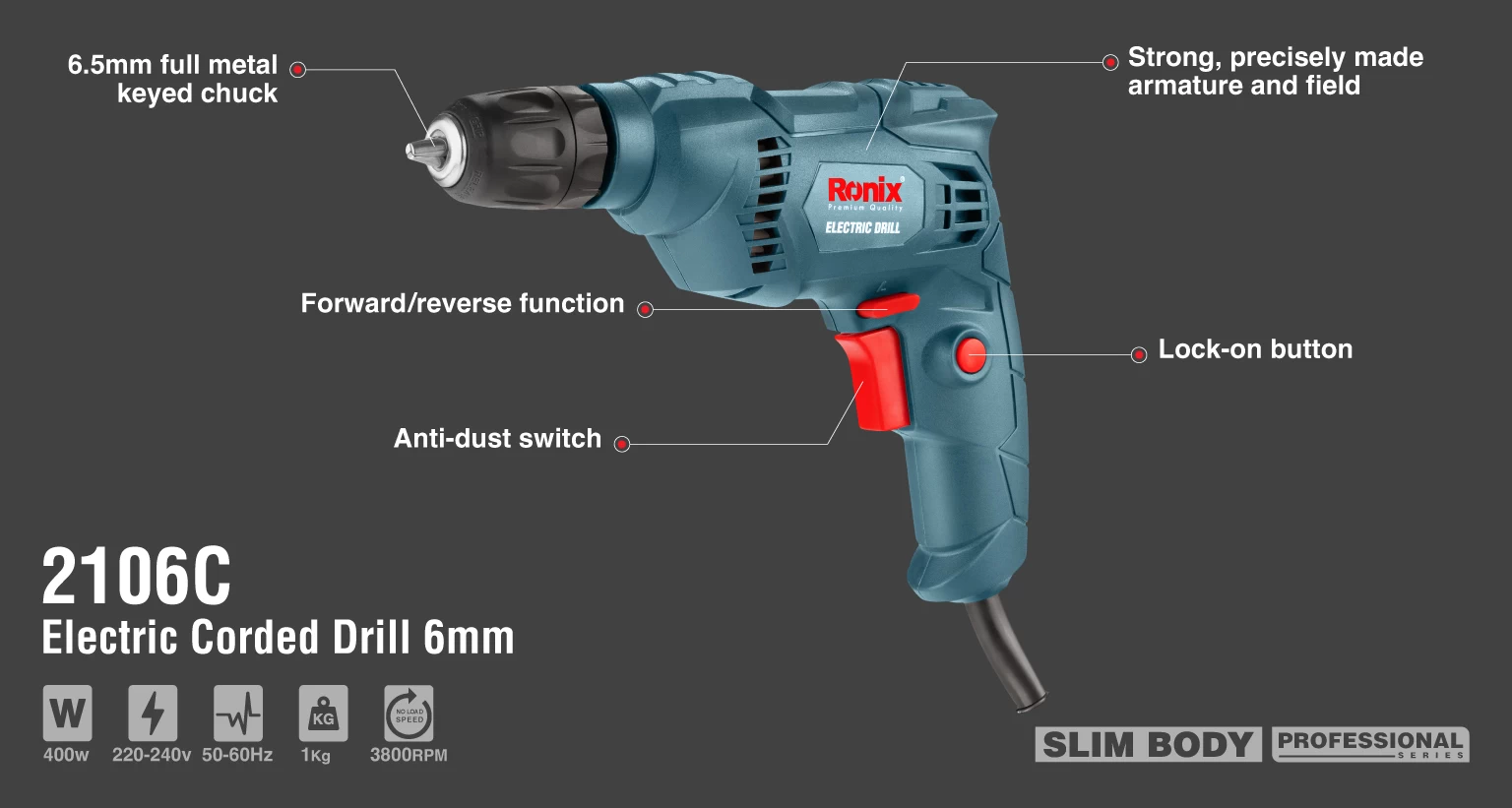 دریل برقی 6 میلیمتری رونیکس مدل 2106C، ابزاری خوشدست و درعینحال قدرتمند برای انجام انواع کارهای خانگی و صنعتی است. این دریل برقی با موتور 400 واتی و سرعت چرخش قابل تنظیم تا 3800 دور بر دقیقه، توان بالایی در سوراخکاری و پیچکاری سطوح چوبی و فلزی دارد.سهنظام این دریل برقی اتوماتیک و 6 میلیمتری است و به راحتی میتوان مته آن را تعویض کرد. بدنه مستحکم این دریل بسیار خوشدست و فقط 1,34 کیلوگرم وزن دارد.برای آشنایی بیشتر با دریل برقی 6 میلیمتری اتوماتیک رونیکس مدل 2106C، در بخش توضیحات محصول با ما همراه باشید.