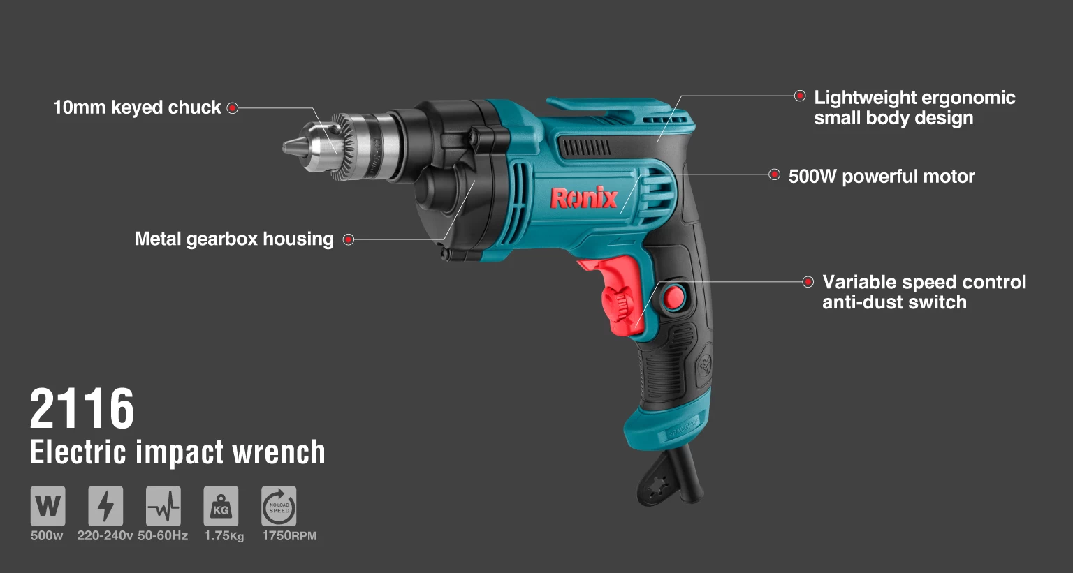 دریل برقی 2116 رونیکس، دارای نیمتنه فلزی است و با موتور پرقدرت 500 وات کار میکند. همچنین، مجهز به سهنظام دوتکه مستحکم، 10 میلیمتری و آچاری است که بر عملکرد دستگاه تاثیرگذار است. این ابزار برقی کاربردی، با برخورداری از اهرم چپگرد/راستگرد میتواند در کنار عملیات دریلکاری به عنوان پیچگوشتی برقی نیز کار کند.