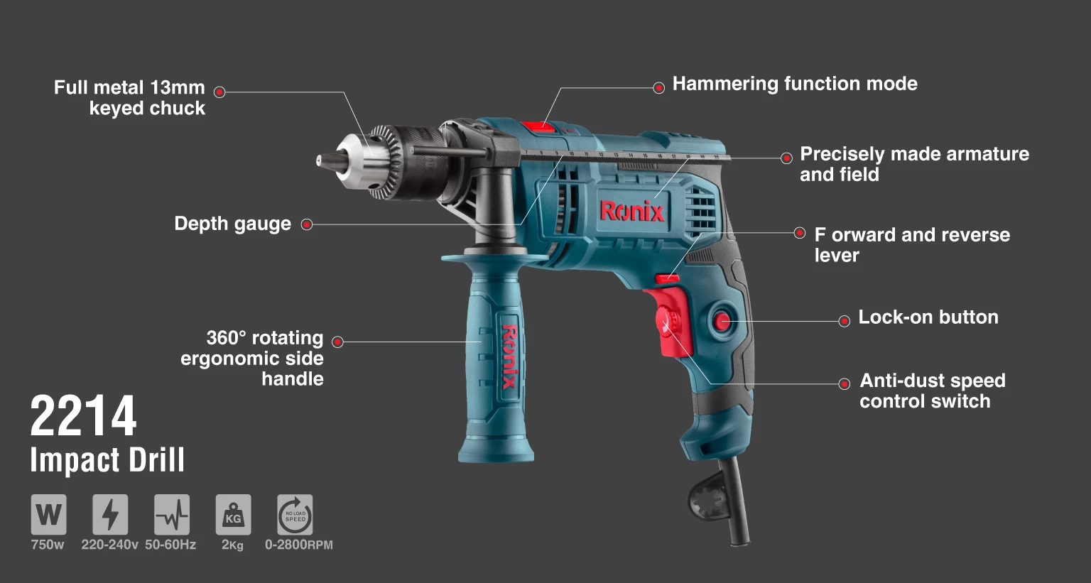 در ادامه، با ویژگیهای دریل برقی چکشی 13 میلیمتری آچاری 750 وات 2800 دور رونیکس با مدل 2214 بیشتر آشنا شوید.