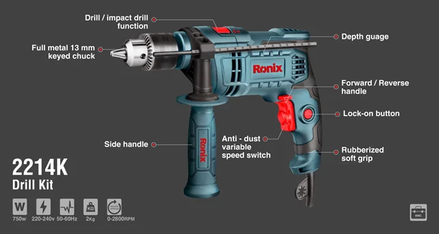 در بخش توضیحات محصول، مشخصات کیت دریل برقی چکشی 13 میلیمتری آچاری 750 وات 2800 دور رونیکس با مدل 2214K را بیشتر بررسی میکنیم.