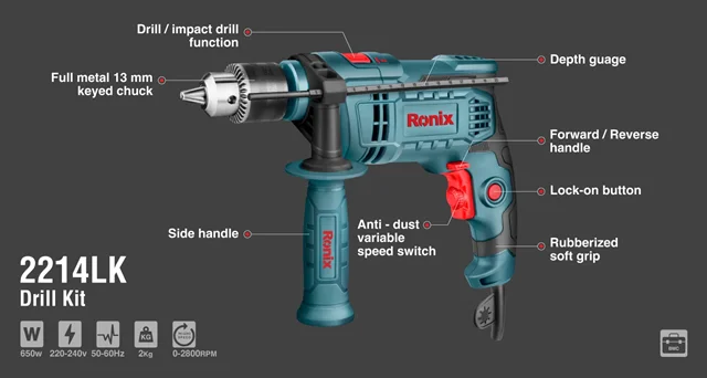 دریل چکشی 2214LK رونیکس، از یک موتور قدرتمند 650 وات، متشکل از آرمیچر و بالشتکهای صنعتی باکیفیت بسیار بالا برخوردار است که استقامت زیادی را در کاربردهای سنگین صنعتی از خود نشان میدهد.