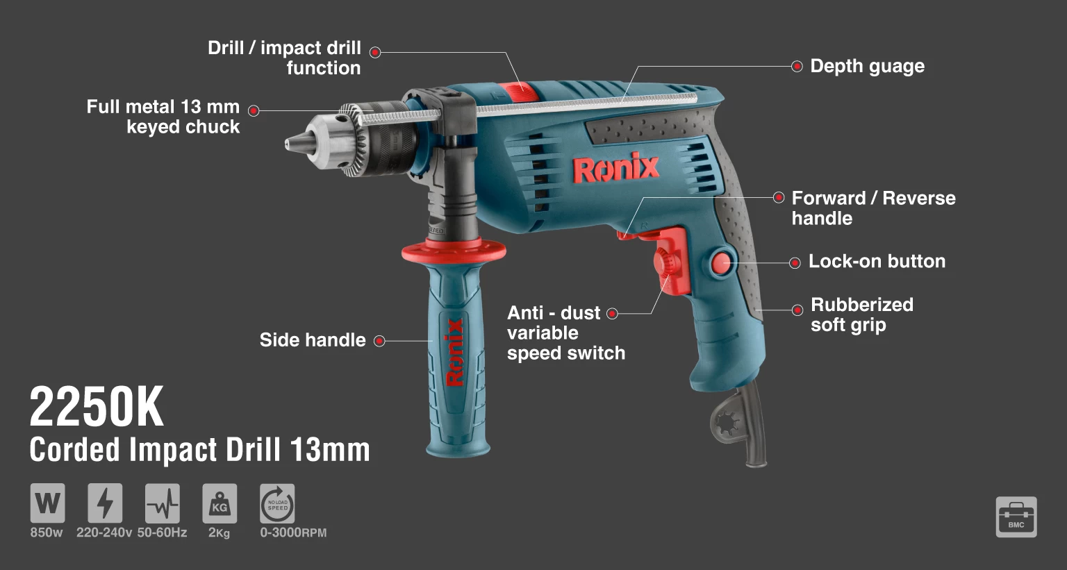 دریل 13 میلی متری چکشی 850 وات+2250k BMC