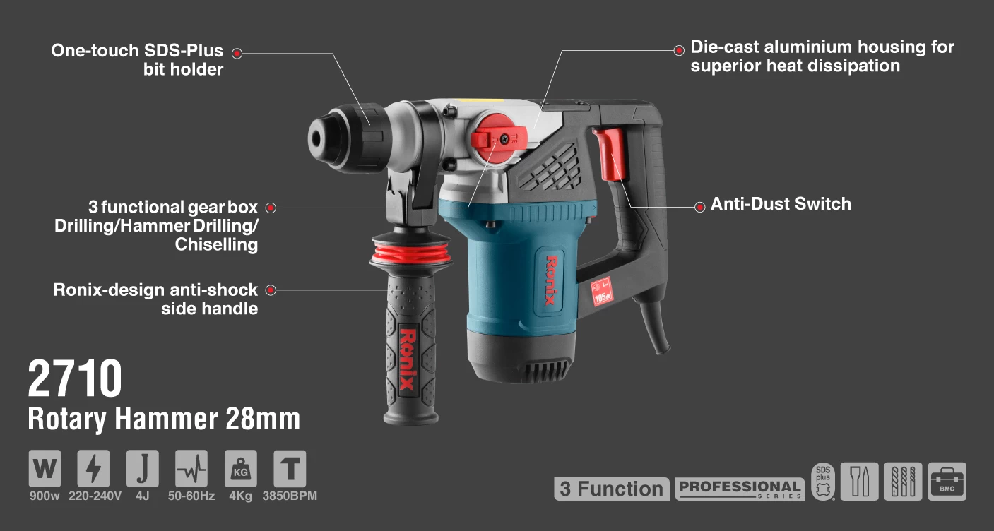بتنکن 28 میلیمتری 2710 رونیکس، مجهز به موتور گیربکسی و قدرتمند 900 وات است که سرعتی بالغ بر 980 دور بر دقیقه و تعداد 3850 ضربه بر دقیقه را ایجاد میکند. مجموعه ابزارگیر چهارشیار این دستگاه، به ظرفیت 28 میلیمتر و مناسب برای سطوح چوبی، فلزی و بتنی طراحی شده است. کلید تغییر حالت در دریل بتنکن 2710 رونیکس، عملکردهای سوراخکاری، سوراخکاری چکشی و تخریب را تنظیم میکند. همچنین، این دستگاه، دارای بدنهای مقاوم از جنس منیزیم دایکاستشده است که همزمان با داشتن وزن پایین، موجب اتلاف حرارتی کمتر و افزایش مقاومت بدنه میشود. دسته جانبی 360 درجه و ضد لرزش در این بتنکن، باعث میشود تا خستگی کاربر در حین کار طولانیمدت کاهش یابد.در بخش شرح جزئیات محصول، بیشتر با بتنکن برقی 28 میلیمتری 900 وات رونیکس مدل 2710 آشنا شوید. مشخصاتثبت دیدگاهاشتراکگذاریدانلودهاکاتالوگ تک برگراهنمای کاربرینقشه انفجاریبتنکن 2710 رونیکس، سرعت و دقت فوقالعاده بالایی را در عملکردهای سوراخکاری، تخریب و سوراخکاری چکشی ارائه میدهد. بتنکن 28 میلیمتری 900 وات 2710 رونیکس چه ویژگیها و مزایایی برای کاربران دارد؟