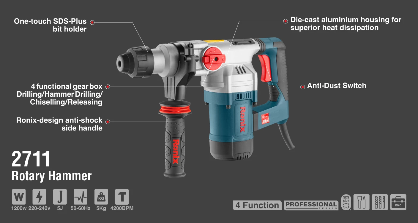 بتنکن 32 میلیمتری رونیکس با مدل 2711، مجهز به موتور گیربکسی صنعتی و قدرتمند 1200 وات است که سرعتی بالغ بر 1050 دور بر دقیقه را ایجاد میکند و نرخ ضربه آن 4200 ضربه بر دقیقه است. مجموعه ابزارگیر این دستگاه، چهارشیار (SDS PLUS) و ضد غبار با ظرفیت 32 میلیمتر بوده و متناسب با سطوح چوبی، فلزی و بتنی طراحی شده است. در این بتنکن، کلید تغییر حالت برای تنظیم 4 عملکرد مجزای سوراخکاری، سوراخکاری چکشی، تخریب و خلاصکن تعبیه شده است. مشخصه دیگر این دستگاه، برخورداری از سیلندر با ظرفیت بالا است که برای تولید ضربههایی با توان 5 ژول و افزایش کارایی و اثربخشی دستگاه مناسب است. جهت آشنایی بیشتر با بتنکن برقی 32 میلیمتری 1200 وات رونیکس مدل 2711، بخش شرح جزئیات محصول، راهنمای مناسبی برای شما خواهد بود.