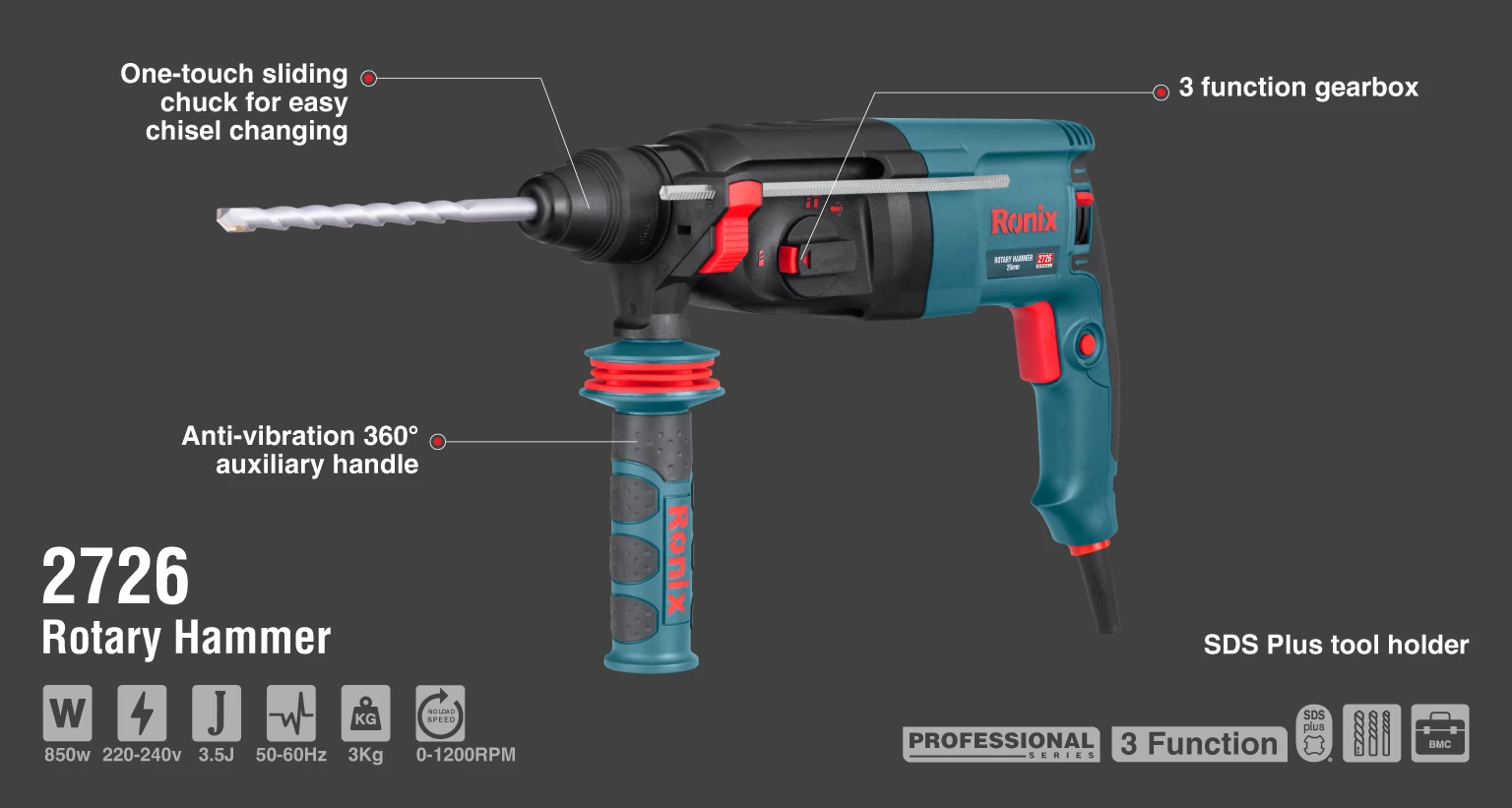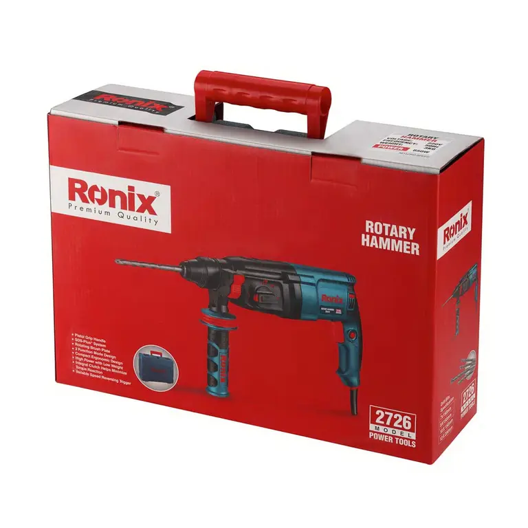 بتنکن 2726 رونیکس، مجهز به موتور قدرتمند 850 وات، گیربکس صنعتی مقاوم و باکیفیت و بدنهای با طراحی ارگونومیک، سبکوزن و مستحکم است. این ابزار با سه حالت عملکرد سوراخکاری، سوراخکاری چکشی و چکشی، انعطافپذیری بالایی در کارهای مختلف ارائه میدهد. این بتنکن مجهز به کلاچ ایمنی پیشرفته است که باعث افزایش ایمنی در حین کار با سطوح مختلف به ویژه سطوح متراکمتر میشود.سیستم ابزارگیر این محصول از نوع SDS-PLUS یا چهارشیار انتخاب شده که میتواند متههایی با قطر 26 میلیمتر را ثابت نگه دارد و موجب افزایش تاثیر عملکرد این محصول شود. این بتن کن دارای بلبرینگهای ضد غبار و دور بالا است. نرخ ضربه 4000 ضربه بر دقیقه و سرعت بدون بار 1200 دور بر دقیقه، این بتن کن را به گزینهای حرفهای برای سوراخکاری در بتن، فولاد و چوب تبدیل کرده است.در ادامه با مشخصات فنی بتنکن 26 میلیمتری 850 وات رونیکس مدل 2726، بیشتر آشنا شوید.