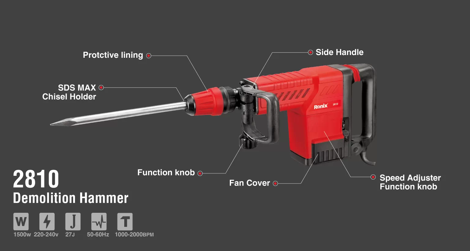 - مجهز به موتوری قدرتمند با توان 1500 وات و توان ضربه 25 ژول مناسب برای انواع عملیات تخریب