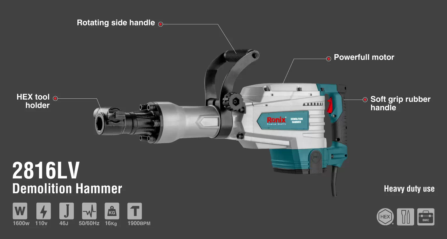 تخریب سطوح مختلف همچون دیوارها، ستون ها، کف و... در صنایع ساختمانی و شهرسازی از جمله فعالیت های بسیار سنگینی است که بر عهده ابزارآلات قدرتمند گذاشته می شود. ابزارهایی با توان ورودی و توان ضربه بالا و همین طور با بدنه بسیار مستحکم که بتوانند فشار حاصل از تخریب های بزرگ را متحمل شده و دچار آسیب نشوند. در کنار تمام این ویژگی ها، داشتن بدنه ارگونومیک نیز از فاکتورهای بسیار مهم در انتخاب یک چکش تخریب است. محصولی که وزن و طراحی مناسب تری داشته باشد و به راحتی قابل استفاده باشد، قطعا در اولویت انتخاب ما قرار خواهد گرفت. چکش تخریب صادراتی 2816LV مجهز به موتوری 1600 واتی است. موتوری پرقدرت و متشکل از آرمیچر و بالشتک صنعتی تولید شده توسط دستگاه های تمام اتوماتیک که 1900 ضربه در دقیقه تولید می کند. همچنین توان ضربه بالغ بر 46 ژول، امکان نفوذ مته در بتن و دیگر سطوح متراکم را برای این دستگاه فراهم کرده است. وجود بلبرینگ های ضدغبار NSK نیز باعث افزایش طول عمر مفید موتور شده و مولدی ایده آل برای انجام عمل تخریب ساخته است. قدرت تخریب در این محصول به واسطه وجود این موتور به بالاترین حد خود رسیده است.