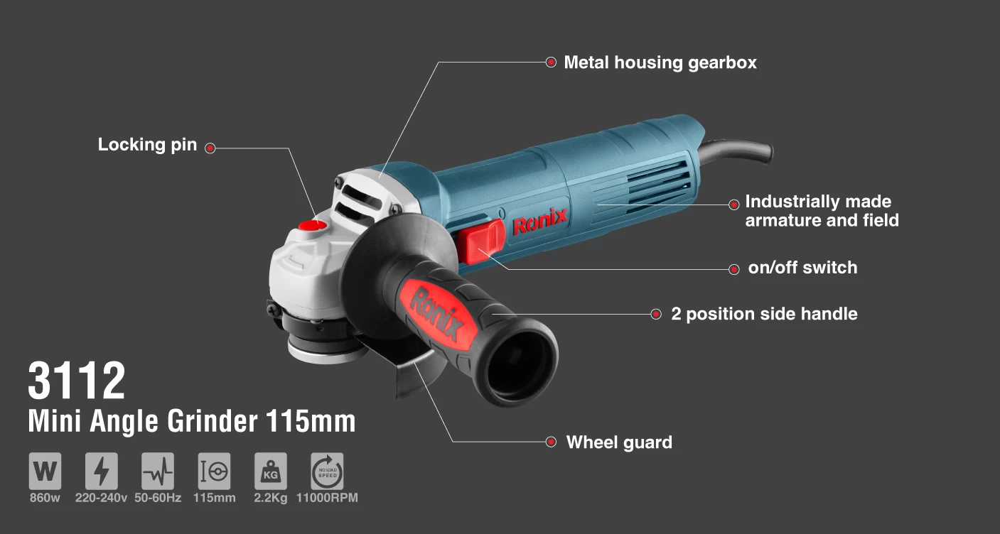 مینی فرز 3112 رونیکس، ابزار برقی قدرتمند و مناسبی برای برش و پرداخت سطوح مختلف بوده و با ابعادی کوچک و وزن 2.2 کیلوگرم ساخته شده است. این دستگاه ظریف، خوشدست و کارآمد، مجهز به موتور پرقدرت 860 وات است که از آرمیچر و بالشتکهای صنعتی با کیفیت بالا تشکیل شده است. دستگاه قادر است با سرعتی بالغ بر 11000 دور در دقیقه کار کند و نیروی لازم برای به گردش درآوردن صفحاتی به قطر 115 میلیمتر را ایجاد میکن