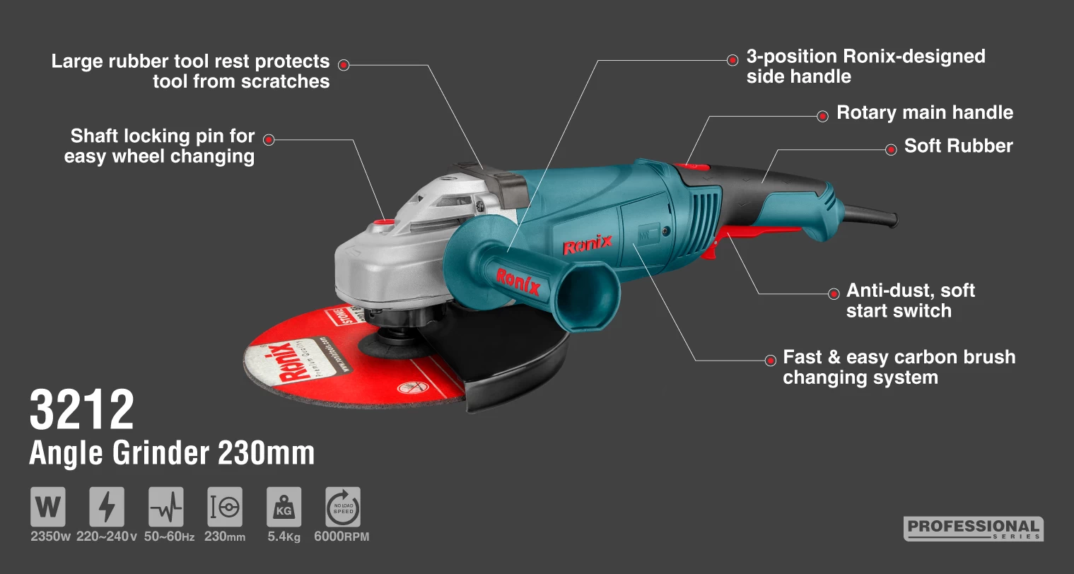 فرز برقی سنگبری 3212 رونیکس، از مهمترین و پرکاربردترین ابزارهای مورد نیاز در صنعت ساختمانسازی است و برای برش انواع سنگ از آن استفاده میشود. این فرز، دارای موتور صنعتی و قدرتمند 2350 وات است که سرعتی بالغ بر 6000 دور بر دقیقه را ایجاد میکند و برای کار با صفحات برش با قطر 230 میلیمتر مناسب است.