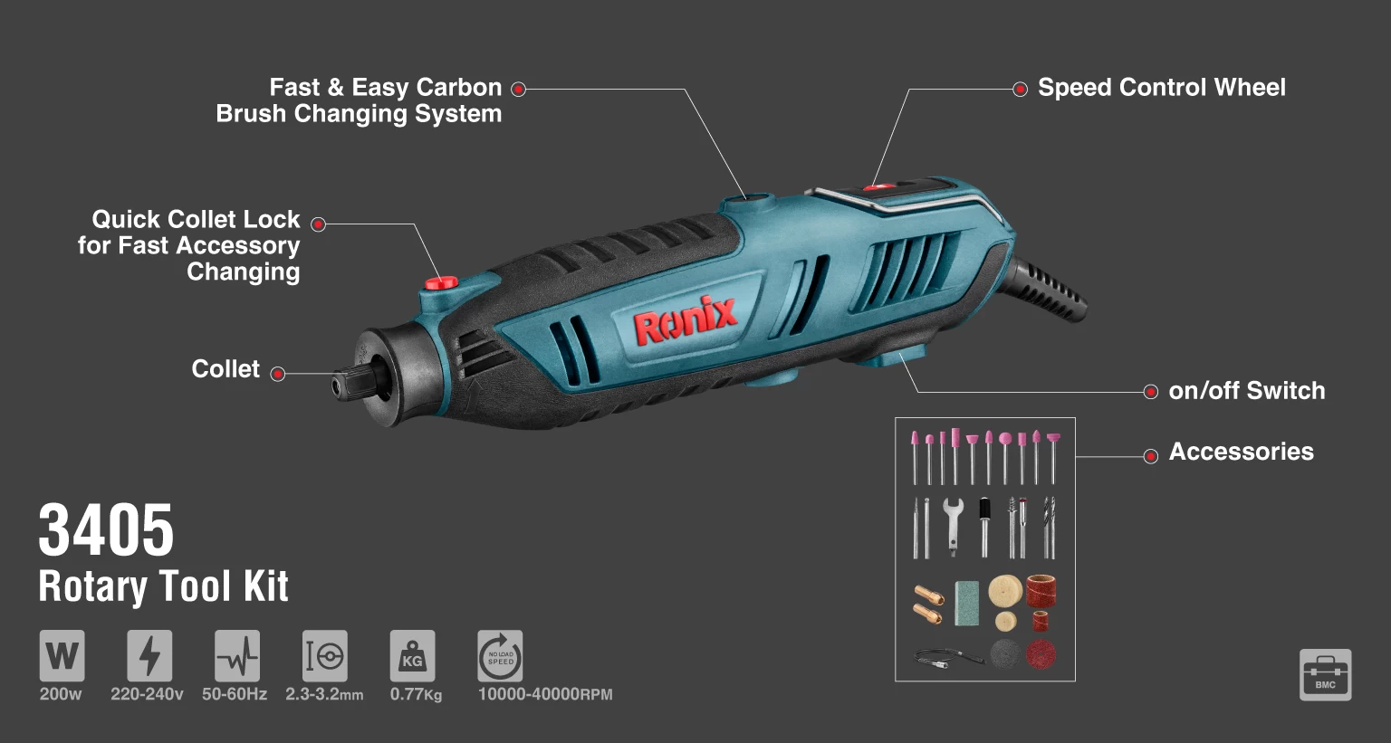 فرز کوچک اما بسیار پرکاربرد 3405 رونیکس، مختص کارهای هنری طراحی شده است و در فعالیتهایی مانند فرزکاری، سنبادهزنی، پولیشکاری، سنگزنی، کندهکاری، پرداخت و ... که نیاز به دقت و ظریفکاری بالایی دارند، مورد استفاده قرار میگیرد. این فرز کوچک به صورت ست 100 عددی در کیف مقاوم و ضد ضربهی BMC، همراه با سریهای متنوع و متعلقات کامل ابزارآلات چرخشی ارائه میشود.فرز برقی مینیاتوری 3405، مناسب کاربردهای صنعتی نیست و هرگونه استفادهی سنگین، صنعتی و اعمال فشار بیش از حد، منجر به آسیب به آن خواهد شد.
