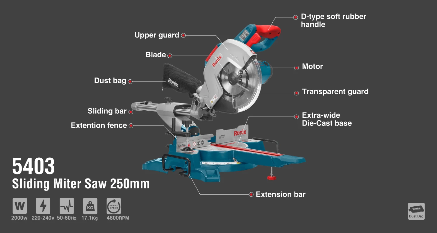 هدف از طراحی و تولید فارسیبر کشویی 250 میلیمتری 2000 وات رونیکس با مدل 5403، ارائهی محصولی کمحجم و سبکوزن با توجه به نیاز بازار بوده است. در این فارسیبر قدرتمند رونیکس، قرارگیری سیستم کشویی به صورت مورب، باعث شده تا قسمت انتهایی محصول حذف شود و دستگاه، فضای کمتری را اشغال کند. قابلیت برش زاویهای بر روی بازو، برش میزی بر روی زوایای مختلف و قابلیت عریضشوندگی، از ویژگیهای شاخص این فارسیبر رونیکس با موتور قدرتمند 2000 وات هستند.