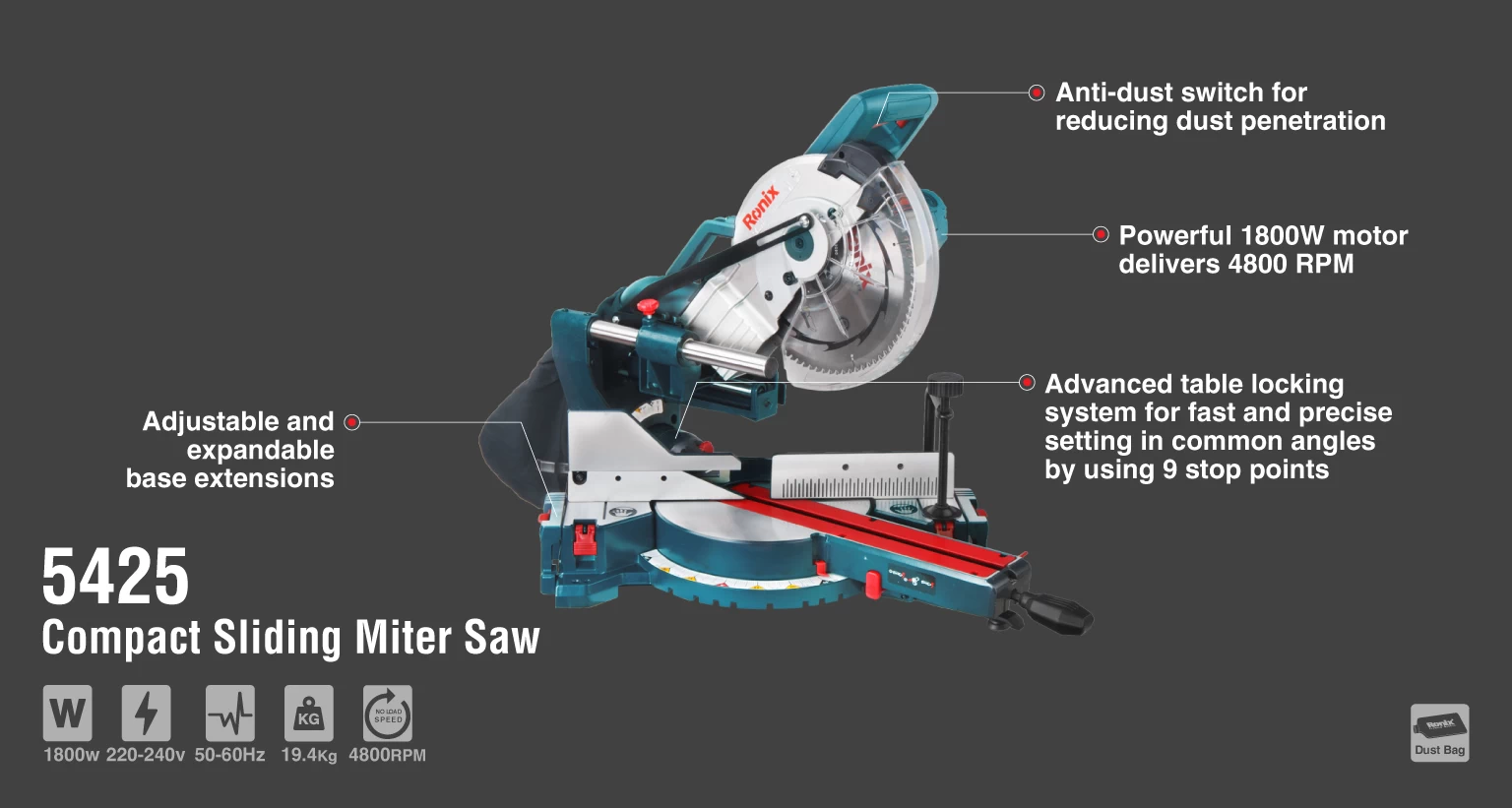 فارسیبر کشویی 250 میلیمتری مدل کامپکت 5425 رونیکس، ابزاری قدرتمند و دقیق برای برشهای زاویهدار در چوب و مواد مشابه است. این دستگاه فارسیبر با موتور 2000 واتی قدرتمند کار میکند که از آرمیچر و بالشتک صنعتی تولید شده است. ابزار برش زاویهدار 5425 رونیکس دارای تیغۀ اره الماسۀ گرد به قطر 254 میلیمتر است که امکان برشهای عمیق و گسترده را فراهم میکند. همچنین، ابعاد جمعوجور و کامپکت دستگاه امکان حمل و نقل آن را آسان میکند. این ابزار برش رونیکس به سیستم ریلی مورب کشویی بلبرینگی مجهز است که کلیۀ فعالیتهای برشکاری با دامنۀ برش وسیع و سریع را برای کاربر ایجاد میکند. برشهای زاویهدار دستگاه از دو موضع کفی و بازویی صورت میگیرد. مکانیزم قفل شفت که در این فارسیبر رونیکس به کار برده شده امکان تعویض سریع و آسان صفحۀ برش را فراهم میکند. فارسیبر کشویی مدل کامپکت 5425 رونیکس برای استفادۀ نجاران، نصابان کفپوش و سایر کاربرانی که در حرفهشان به دستگاهی برای انجام برشهای دقیق نیاز دارند، مناسب است.