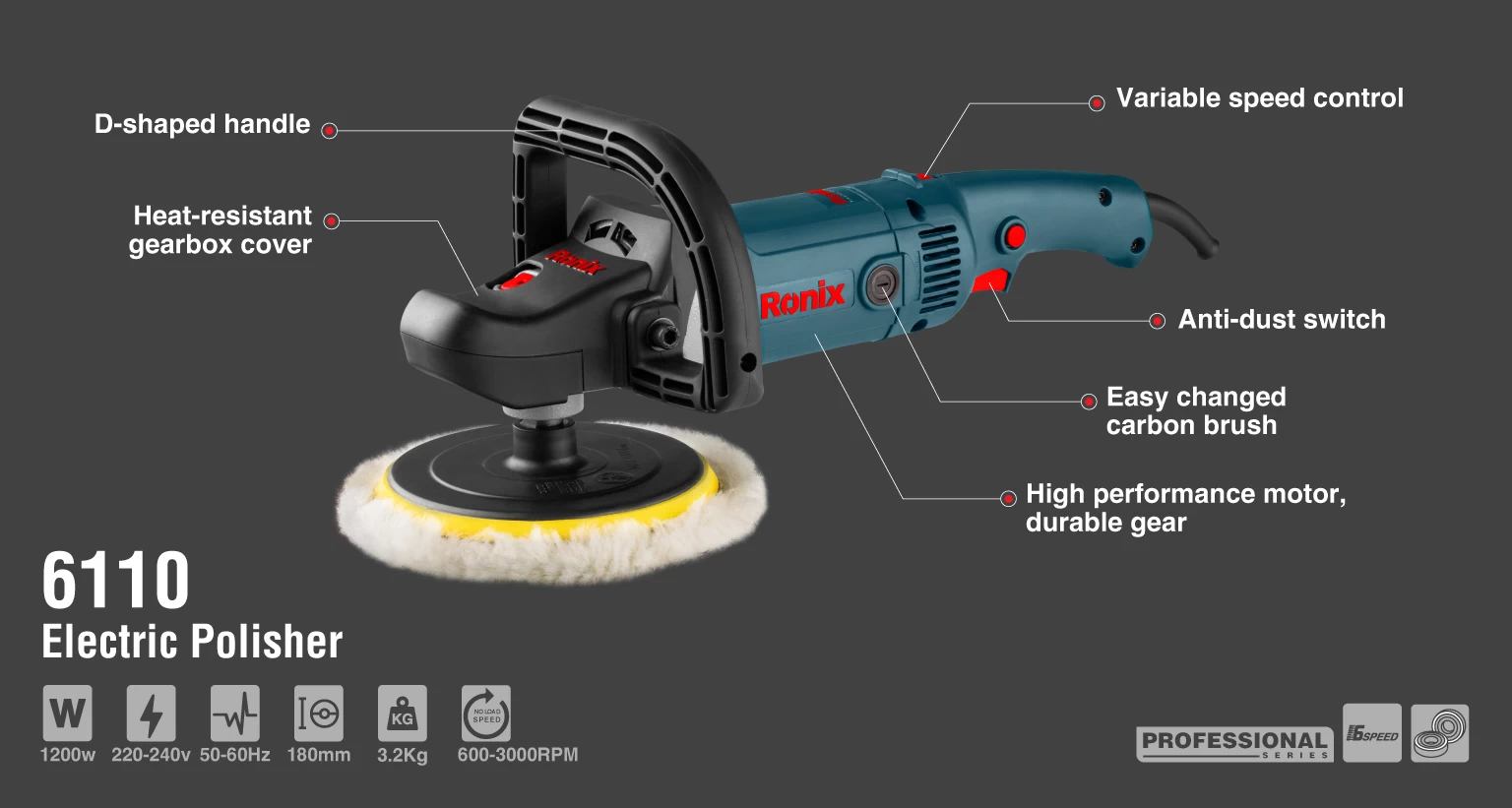 پولیش برقی دیمردار رونیکس با مدل 6110، از موتور قدرتمند گیربکسی به توان 1200 وات بهره میبرد. میتوانید سرعت این دستگاه را با توجه به کاربریهای مختلف پولیشکاری، پرداختکاری و زنگزدایی سطوح مختلف، به وسیلهی دیمر 6 حالته و در محدودهی 600 تا 3000 دور در دقیقه تنظیم کنید. سوئیچ و کلکتور این دستگاه از جنس مس با خلوص بالا ساخته شده تا موتور بتواند توان 1200 وات واقعی را در حین کار ایجاد کند.پوشش پلاستیکی بدنهی گیربکس با طراحی ارگونومیک، علاوه بر هدایت راحتتر دستگاه، مانع از آسیبدیدن دستان کاربر در اثر گرمای تولیدی گیربکس میشود. ذغال باکیفیت گرافیتی، بلبرینگهای ضد غبار و دور بالای NSK، کلید ضد غبار و ... از دیگر مزایای منحصربهفرد این ابزار برقی پرکاربرد هستند.