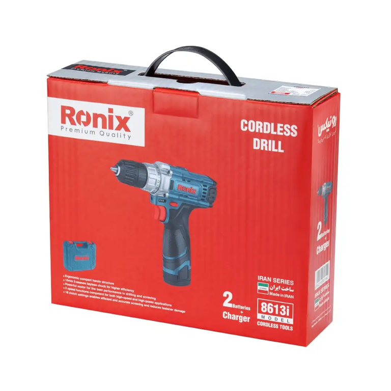دریل پیچگوشتی شارژی 12 ولت رونیکس مدل 8613i، ساخت ایران است. این ابزار شارژی، ترکیبی از دو ابزار دریل و پیچگوشتی بوده و دارای یک سه نظام اتوماتیک دو پوسته 10 میلیمتری است که موجب عملکرد بهتر این دریل پیچگوشتی شارژی میشود. طراحی ارگونومیک بدنه و دسته با روکش ضد لرزش، گیربکس دو حالته، کلاچ با قابلیت تنظیمات هجدهگانه، ارائه ابزار با کیف BMC مقاوم به ضربه و متعلقات کاربردی، از مهمترین مزایای این دریل پیچگوشتی شارژی تاپ لاین هستند. میتوانید با دریل پیچگوشتی شارژی 8613i رونیکس، در مکانهای با دسترسی محدود، تاریک و بدون برق، با خیال راحت و بدون نگرانی از تمامشدن شارژ باتری کار کنید.در بخش شرح جزئیات محصول، با مشخصات فنی دریل پیچگوشتی شارژی 12 ولت رونیکس مدل 8613i بیشتر آشنا شوید.
