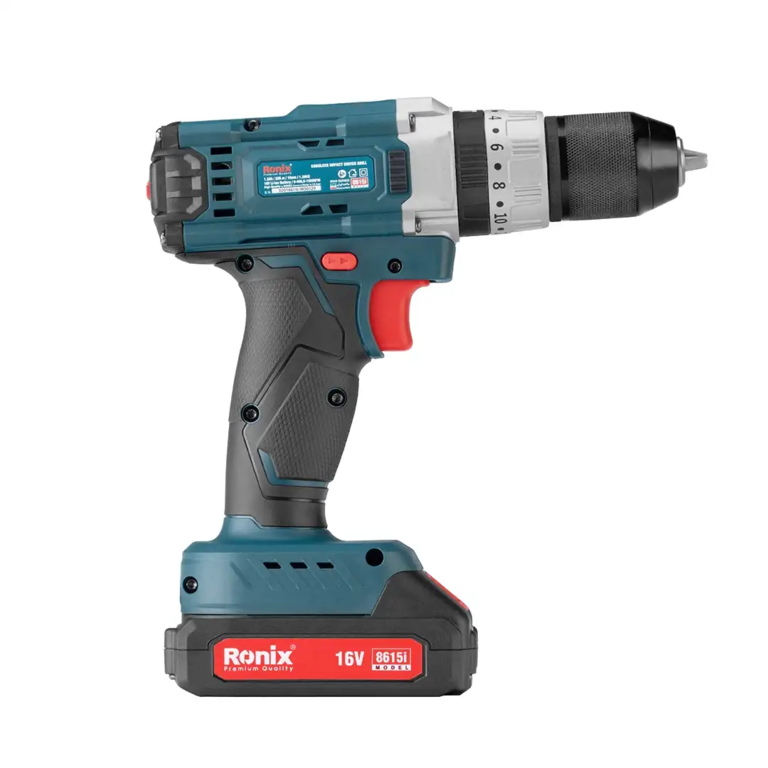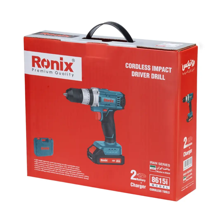 دریل پیچگوشتی شارژی 16 ولت 8615i رونیکس، ساخت ایران است. این محصول تاپ لاین، ابزاری قدرتمند با سه عملکرد مجزای سوراخکاری، پیچکاری و سوراخکاری چکشی است. دریل پیچگوشتی شارژی 8615i از یک سهنظام اتوماتیک و قدرتمند 10 میلیمتری و تمامفلزی بهره میبرد که نسبت به فشار حاصل از فعالیت در سطوح متراکم مقاومت خوبی از خود نشان میدهد. همچنین، این دستگاه شارژی، عملکرد مناسبی حین سوراخکاری سطوح بتنی، فلزی و چوبی دارد. طراحی ارگونومیک و مقاوم بدنه، گیربکس دو حالته، امکان تغییر گشتاور با تنظیمات کلاچ در 18 حالت مختلف، ارائه ابزار با کیف BMC مقاوم به ضربه به همراه متعلقات کاربردی، از مهمترین ویژگیها و مزایای این دریل پیچگوشتی چکشی شارژی 16 ولت هستند. در ادامه، با مشخصات فنی دریل پیچگوشتی چکشی شارژی رونیکس مدل 8615i بیشتر آشنا شوید.
