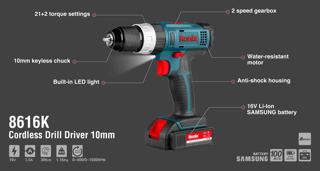 - عملکرد فوق العاده و عمر بالا، به همراه باتری 1.5 آمپر 16 ولتی با قابلیت شارژ سریع