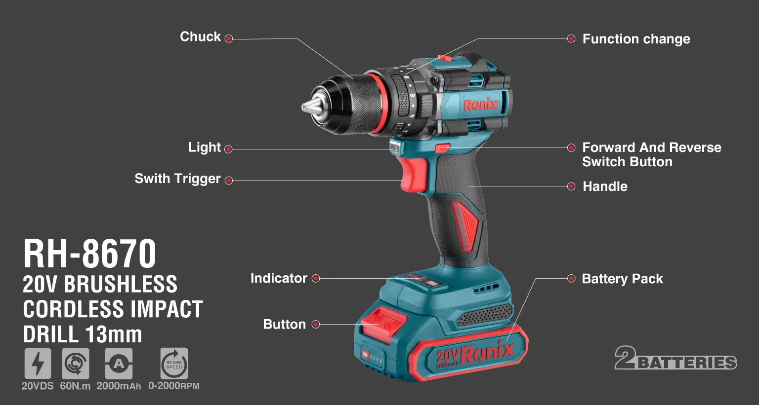 دریل شارژی براشلس 20 ولتی رونیکس مدل 8670 با موتور قدرتمند براشلس و ضد آب خود، ابزاری حرفهای برای انواع کارهای فنی و دریلکاری است. این دریل شارژی با ولتاژ 20 ولت و حداکثر گشتاور 60 نیوتنمتر، سوراخکاری و پیچکاری سطوح مختلف مانند چوب، فلز و مصالح ساختمانی را به راحتی انجام میدهد. همچنین به دلیل براشلس بودن موتور، نیاز به نگهداری مداوم کمتر شده و دوام بالایی حین کار دارد.دریل شارژی چکشی براشلس رونیکس با 3 کارکرد متهکاری، پیچکاری و حفاری چکشی و طراحی بدنه کوچک و ارگونومیک، قدرت بالایی را در حین کار ارائه میدهد. بدنه ضد ضربه و مقاوم این ابزار به همراه دستگیره لاستیکی ارگونومیک، استفاده طولانیمدت از این دریل شارژی را ممکن میسازد. این دریل شارژی با 2 باتری لیتیوم یونی 20 ولتی و 2000 میلیآمپر ساعتی میتواند به صورت مداوم کار کند. این باتری در تمامی شارژیهای 20 ولت سری 86 رونیکس قابل استفاده است.در بخش شرح جزئیات محصول، دریل شارژی براشلس 20 ولت چکشی 13 میلیمتری رونیکس مدل 8670 را بیشتر بررسی کنید