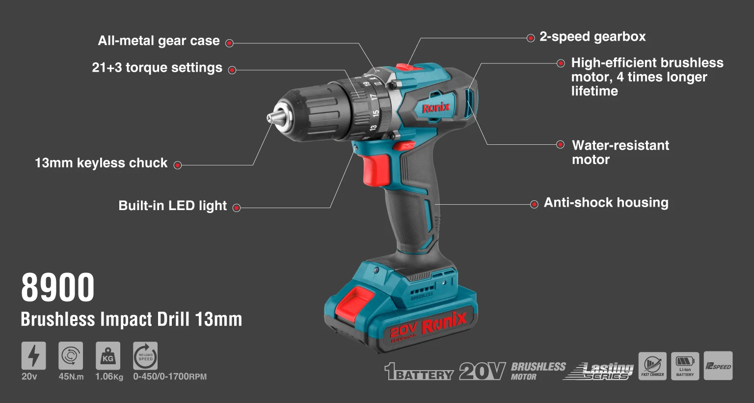دریل پیچگوشتی شارژی 8900 رونیکس، انتخابی ایدهآل برای سه عملکرد سوراخکاری، پیچکاری و سوراخکاری چکشی است. این ابزار شارژی کاربردی و قدرتمند، بر خلاف سایر همتایان خود در بازار که دارای سه نظام 10 میلیمتری هستند، از سه نظام 13 میلیمتری بهره میبرد. به همین دلیل، کاربران میتوانند بدون نیاز به دریل برقی، سوراخهای با قطر بیشتری را حفر کنند.موتور براشلس و مقاوم به رطوبت و غبار در دریل پیچگوشتی 8900 رونیکس، انرژی مورد نیاز خود را از یک عدد باتری لیتیوم یون 20 ولت با طول عمر و دوام بالا تامین میکند. این موتور، 50% طول عمر بیشتر و 25% سرعت و یکنواختی عملکرد بیشتری را از خود نشان میدهد. برای آشنایی بیشتر با مشخصات فنی دریل پیچگوشتی چکشی شارژی 13 میلیمتری براشلس 20 ولت رونیکس با مدل 8900، بخش جزئیات محصول راهنمای خوبی برای شما است.