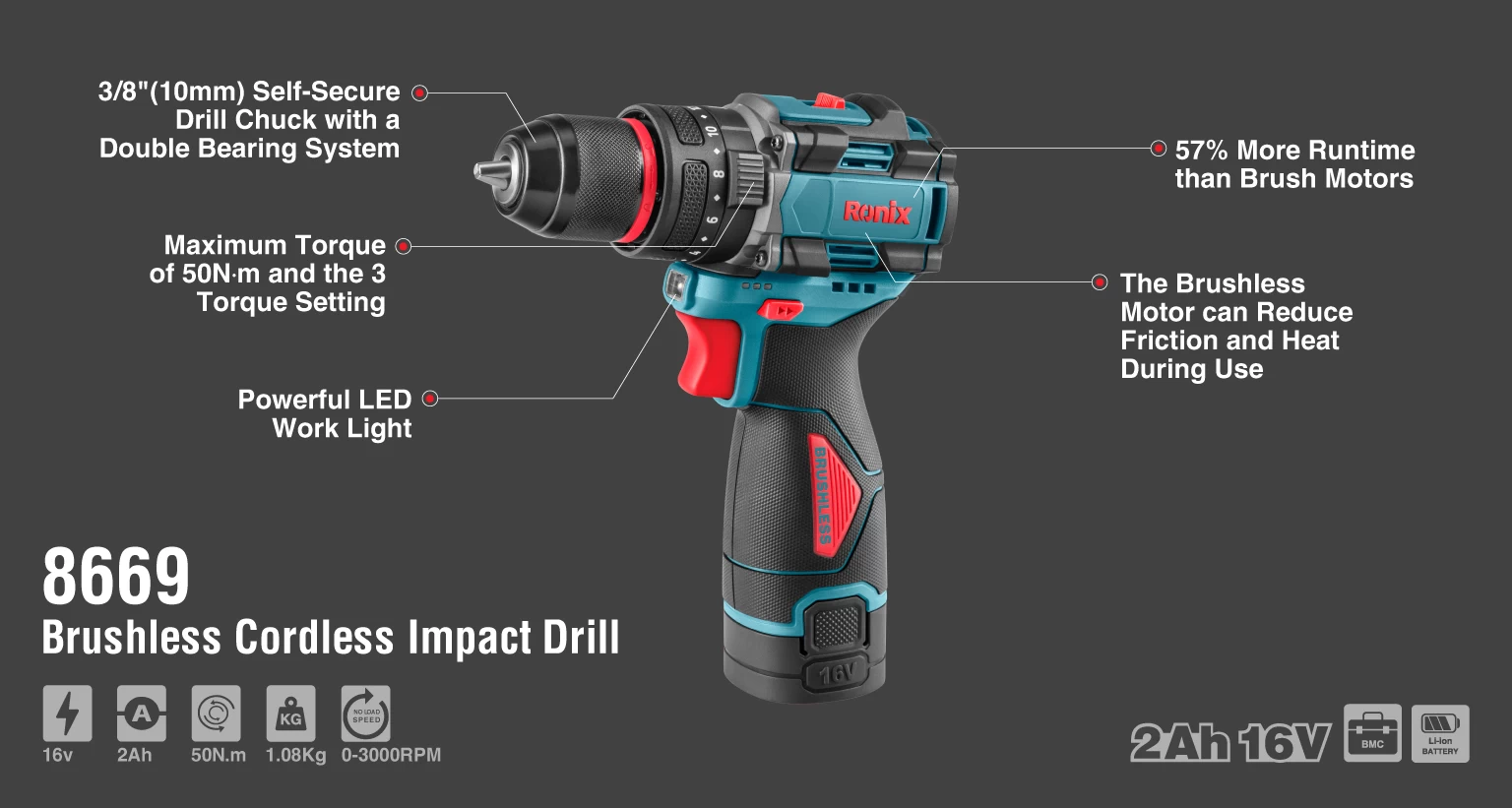 مزیت مهم ابزارهای شارژی این است که نیازی به استفاده از برق شهری ندارند و کاربر آزادانه میتواند ابزار شارژی را با خود حمل کند. دریل شارژی براشلس 16 ولت مدل 8669 رونیکس با طراحی جمعوجور و بدنۀ ارگونومیک، طیف گستردهای از نیازهای کاربران را در عملیاتهای سوراخکاری، سوراخکاری چکشی و پیچکاری پوشش میدهد.دریل چکشی شارژی رونیکس مدل 8669 رونیکس مجهز به موتور براشلس ضد غبار و ضد آب است و میان اجزا و قطعات آن در هنگام کار اصطکاک کمتری صورت میگیرد. در نتیجه، دستگاه داغ نمیشود و طول عمر ابزار و باتری را افزایش پیدا میکند. باتری لیتیوم یونی 16 ولتی، سهنظام اتوماتیک و نشانگر طول عمر باتری از دیگر ویژگیهای این دریل چکشی رونیکس هستند.