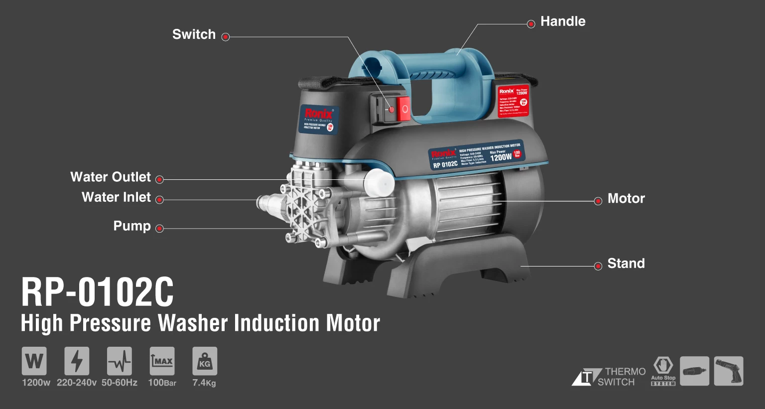 - مجهز به سیستم سوئیچ اتو استاپ که در صورت رها کردن ماشه توسط کاربر به طور خودکار موتور را خاموش میکند و بدین ترتیب افزایش طول عمر موتور را تضمین میکند و همچنین باعث صرفهجویی در انرژی میشود.