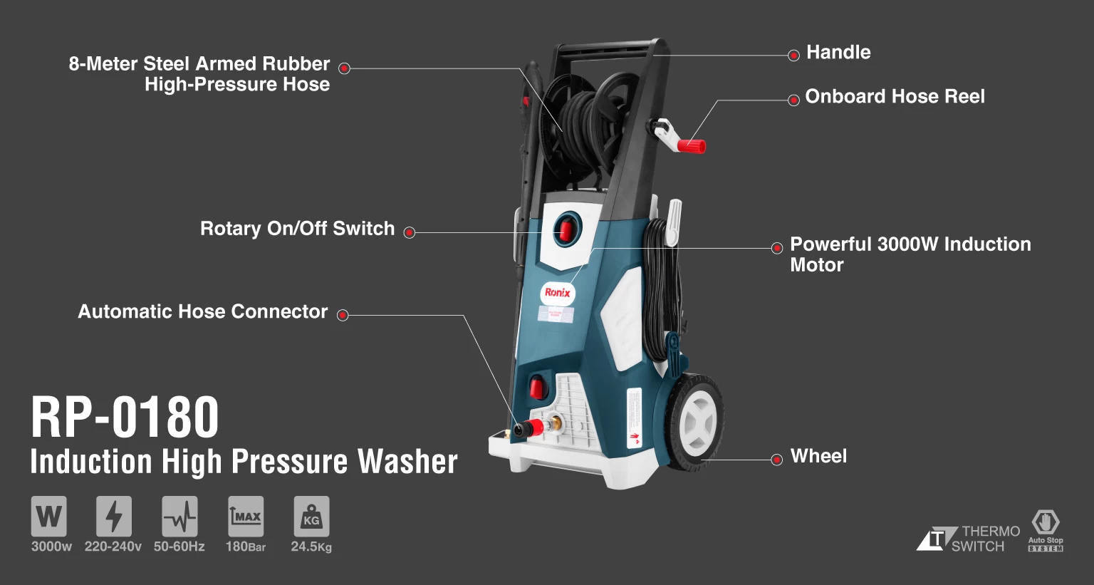 - دارای موتور اینداکشن تمام مسی پرقدرت با توان 3000 وات که باعث افزایش فشار پاشش و توان تمیزکاری میشود. به علاوه این موتور در کنار طول عمر بالا صدای پایینی دارد و کیفیت بالایی در پاشش آب ارائه میدهد.