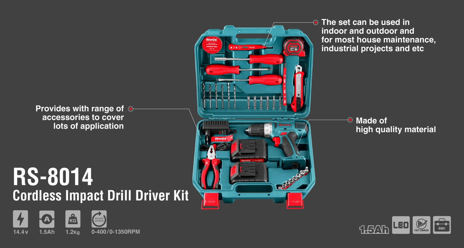 | متعلقات | 1 جفت باتری 1.5 آمپر 14.4 ولت، شارژر با قابلیت شارژ سریع، انبردست، سری بکس 1/4 اینچ :11 ،5،6،7،8،9،10 میلیمتر، ADA رابط پیچگوشتی:دو سو 5.8*100 , چهار سو 5.8*100 ,رابط متر 3متری ،کاتر ، تستر الکتریکی ، چسب برق ، 2 عدد مته بتن ، 2 عدد مته HSS twist ، 2عدد مته چوب 5 و6 میلیمتری سری پیچ گوشتی 50 میلیمتری : PH1,PH2,PZ1,BIT ADA,SL4,SL6 |